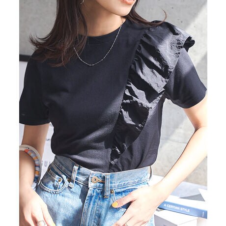 大胆なフリルデザインが印象的なアシンメトリーTシャツ。