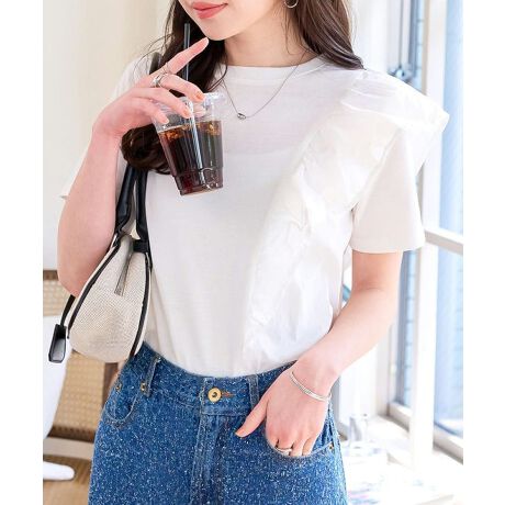大胆なフリルデザインが印象的なアシンメトリーTシャツ。