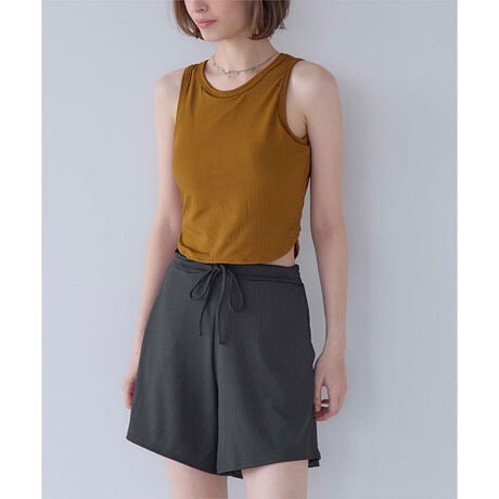 ・ヘルシーなスタイリングを叶えるカップ付きタンクトップ×ハイウエストショーツ×ウエスト紐付きショートパンツの3点セット水着。