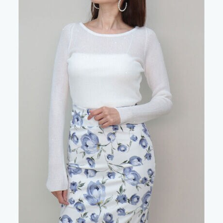 シアー感のあるミドルゲージリブニットトップス。着回しやすいボートネックと柔らかく伸縮する編み地、フィット感が細見えさせながら装いを春らしくアップデートします。ささやかに散りばめられた小さなスパンコールが上品に輝きます。同素材でカーディガンも展開しており、ミント、ブラックはアンサンブルが可能です。[型番:CFKR0380]