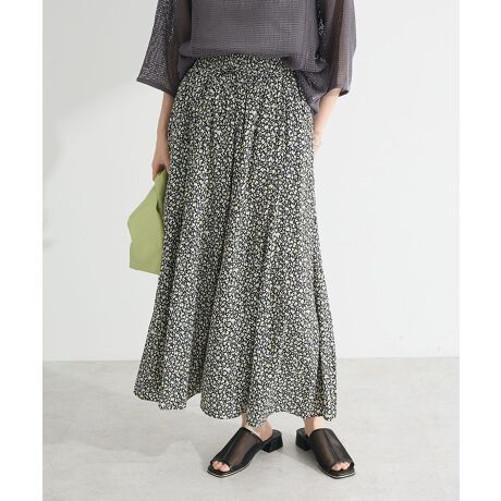 スカート見えする揺れ感がフェミニンな印象のデザインスカーチョ。さらりとしたツヤ感ある素材で軽やかに合わせていただけるシーズナルなお仕立てです。分量感のあるフレアに小付きモチーフの総柄がスタイリングのアクセントに最適。ウエストゴムで楽に着脱出来、シンプルなタックインスタイルも綺麗に決まる使い勝手の良いアイテムです。透け感[ややあり]