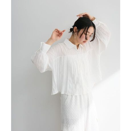 シワ加工を施したナチュラルなワッシャー生地が魅力的なブラウス。ギャザーたっぷりに切り替えた身頃や袖がふんわりとしたシルエットを演出して、フェミニンムードを引き立てます。やや短丈で、トレンドのワイドボトムやスカートとも好相性。シンプルなアイテムと合わせるだけでこなれたコーディネートが完成するおすすめのアイテムです。透け感[ややあり]