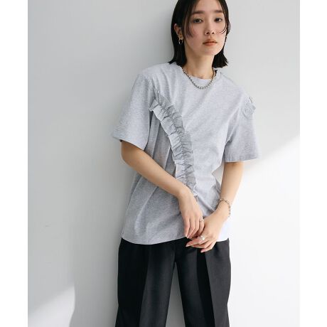 フロントの大きいフリルが目を惹くTシャツ。肩にも小さめのフリルを配し、一枚でサマ見えするデザインが魅力的です。ゆとりのあるサイズ感で快適な着心地なのも嬉しいポイント。合わせるボトムを選ばず、カジュアルからフェミニンまで様々なスタイリングにマッチするおすすめのアイテムです。透け感[ややあり]