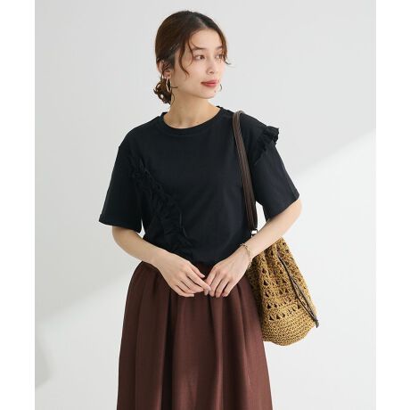 フロントの大きいフリルが目を惹くTシャツ。肩にも小さめのフリルを配し、一枚でサマ見えするデザインが魅力的です。ゆとりのあるサイズ感で快適な着心地なのも嬉しいポイント。合わせるボトムを選ばず、カジュアルからフェミニンまで様々なスタイリングにマッチするおすすめのアイテムです。透け感[ややあり]