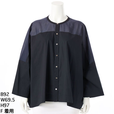 [型番:3253702]夏の終わり、秋に向けての涼しくて万能なオーバーサイズドブラウスを作りました。直線断ちのモダンなシルエットなので1枚で絵になるとてもおしゃれなシャツブラウスです。着丈も長すぎないので色々なボトムスとも相性がよいブラウスです。フロントの肩部分のシアーな生地使いが透けすぎずトレンド感のある上品なデザインになっています。フロントも釦開きになっているので軽い羽織としても重宝する1枚です。