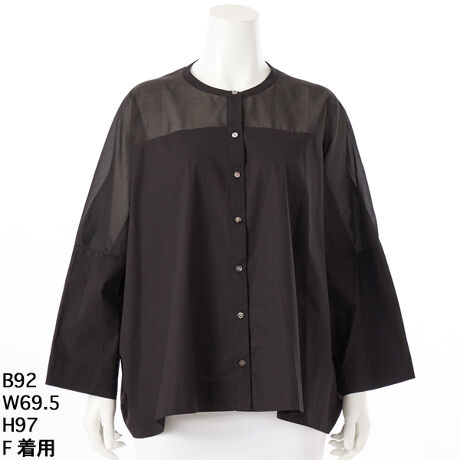 [型番:3253702]夏の終わり、秋に向けての涼しくて万能なオーバーサイズドブラウスを作りました。直線断ちのモダンなシルエットなので1枚で絵になるとてもおしゃれなシャツブラウスです。着丈も長すぎないので色々なボトムスとも相性がよいブラウスです。フロントの肩部分のシアーな生地使いが透けすぎずトレンド感のある上品なデザインになっています。フロントも釦開きになっているので軽い羽織としても重宝する1枚です。