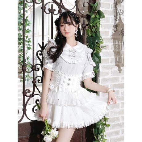 襟や袖口のフリルや、パール調をあしらったデザインがときめきを演出。