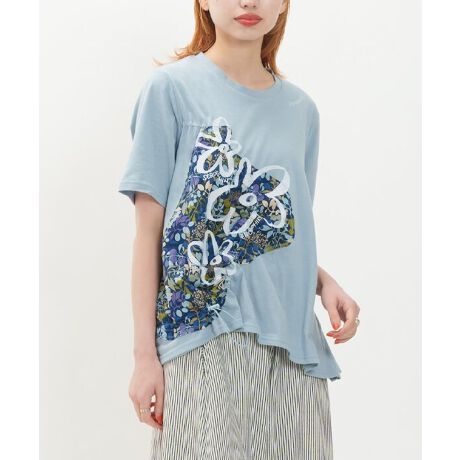 右脇に小花柄の生地がたたかれ、その上からお花のプリントがされているTシャツです。