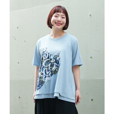右脇に小花柄の生地がたたかれ、その上からお花のプリントがされているTシャツです。