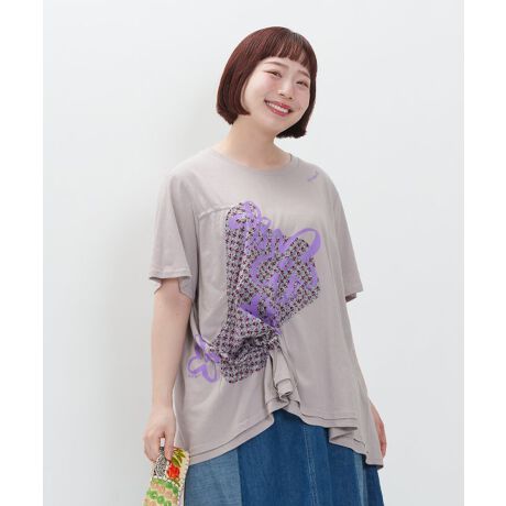 右脇に小花柄の生地がたたかれ、その上からお花のプリントがされているTシャツです。