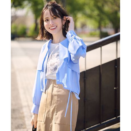 ・ボタンを閉めて短丈シャツトップスとして、開けてライトブルゾン感覚の軽い羽織りとして、着回し力の高さもポイント・ややオーバーサイズでラフに羽織れる・裾の紐を絞ることで丸みのあるフォルムに調整が可能・紐は結ばずに垂らすだけでも可愛いデザイン・着るだけでバランス良く決まる丈感・自然な前後差で腰回りがカバーされるのでパンツ合わせも安心・バンドカラーとカフスデザインがほどよいきちんと感・カジュアルだけでなく綺麗めなボトムとのコーデにも活躍