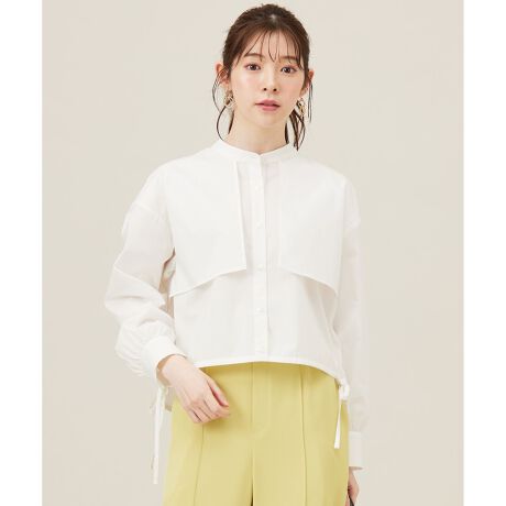 ・ボタンを閉めて短丈シャツトップスとして、開けてライトブルゾン感覚の軽い羽織りとして、着回し力の高さもポイント・ややオーバーサイズでラフに羽織れる・裾の紐を絞ることで丸みのあるフォルムに調整が可能・紐は結ばずに垂らすだけでも可愛いデザイン・着るだけでバランス良く決まる丈感・自然な前後差で腰回りがカバーされるのでパンツ合わせも安心・バンドカラーとカフスデザインがほどよいきちんと感・カジュアルだけでなく綺麗めなボトムとのコーデにも活躍