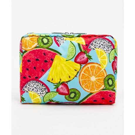 爽やかなターコイズブルーの背景に、鮮やかなトロピカルフルーツをハンドペイント風で描いたプリントデザイン。カラフルで持つだけで気分も上がるギフトにもおすすめのアイテム。