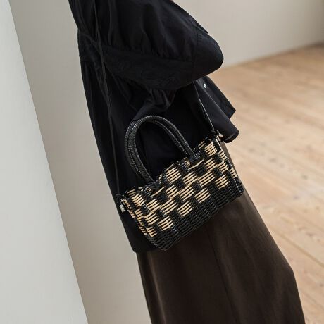 スタイリングのポイントになる、チェック柄のショルダーかごバッグ。