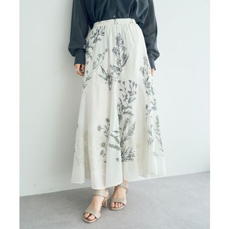 シックなボタニカル柄が目を惹くロマンチックなフレアスカート。斜めの切り替えパターンで表情豊かに広がるシルエットが印象的なデザインです。レーヨン混のコットンボイル生地で落ち感があり、よりナチュラルな風合いを楽しめます。ウエストは総ゴムで履き心地良く、程よく透け感のあるテキスタイルでエアリーな仕上がり。デイリーはもちろん、お出かけやリゾートなど幅広いシーンでお楽しみいただけます。同生地で仕立てたブラウスとのセット合わせもおすすめです。
