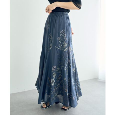 シックなボタニカル柄が目を惹くロマンチックなフレアスカート。斜めの切り替えパターンで表情豊かに広がるシルエットが印象的なデザインです。レーヨン混のコットンボイル生地で落ち感があり、よりナチュラルな風合いを楽しめます。ウエストは総ゴムで履き心地良く、程よく透け感のあるテキスタイルでエアリーな仕上がり。デイリーはもちろん、お出かけやリゾートなど幅広いシーンでお楽しみいただけます。同生地で仕立てたブラウスとのセット合わせもおすすめです。