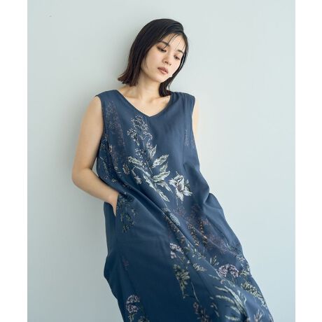 ボタニカル柄を大胆にプリントしたノースリーブワンピース。切り替えパターンで表現した緩やかなAラインシルエットが女性らしい1枚です。レーヨン混のコットンボイルで落ち感があり、サラッとした肌あたりでナチュラルな風合いを楽しめます。前後緩やかなVネックラインで品良く、スタイリングを軽やかに演出。背面にはリボンを施し、実用的なサイズ調整が可能です。春の装いにぴったりなおすすめのアイテムです。