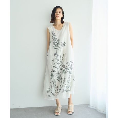 ボタニカル柄を大胆にプリントしたノースリーブワンピース。切り替えパターンで表現した緩やかなAラインシルエットが女性らしい1枚です。レーヨン混のコットンボイルで落ち感があり、サラッとした肌あたりでナチュラルな風合いを楽しめます。前後緩やかなVネックラインで品良く、スタイリングを軽やかに演出。背面にはリボンを施し、実用的なサイズ調整が可能です。春の装いにぴったりなおすすめのアイテムです。