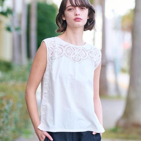 レースデザインですが、甘くなり過ぎずカジュアルな雰囲気に仕上げているので、リネンやデニム素材のボトム等と好相性。
