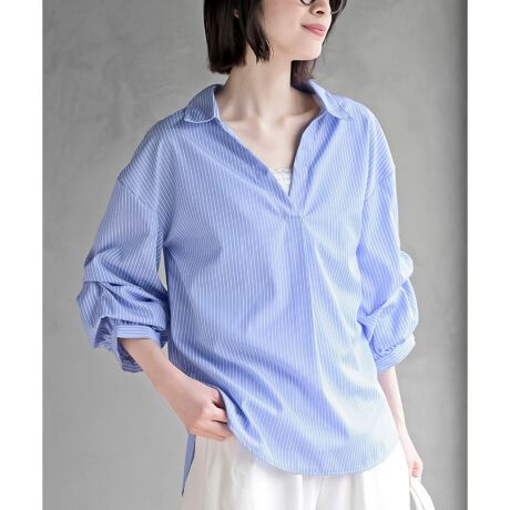 袖のタックがコーデにこなれ感を与えるシャツブラウス。