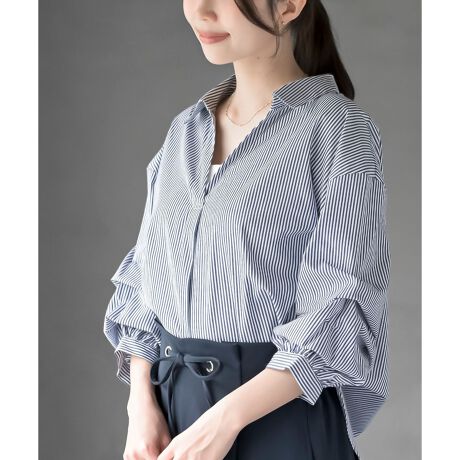 袖のタックがコーデにこなれ感を与えるシャツブラウス。