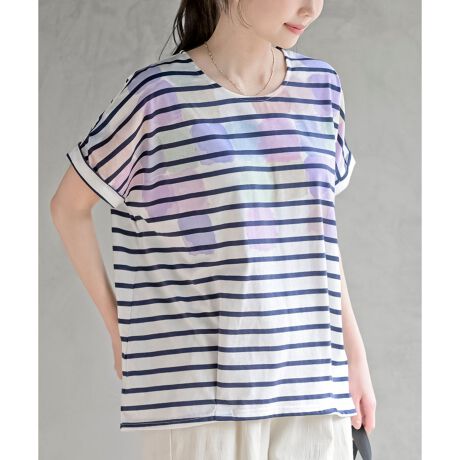 襟元のパステルカラーのブロックプリントが優しい印象を与えてくれます。