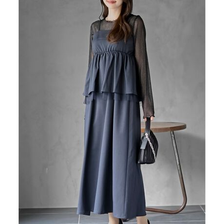 オーバーキャミとスカートのセットアップコーデが楽しめるドッキングワンピ。