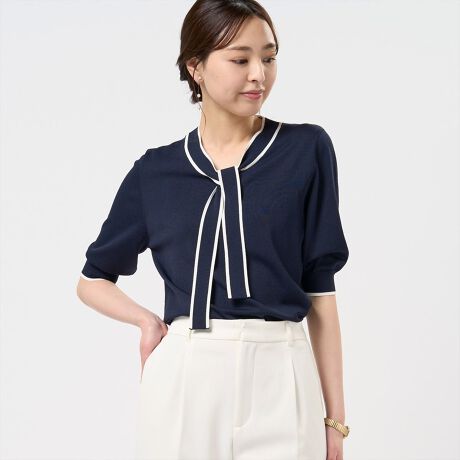 ニット ドライレーヨン 半袖ボウタイプルオーバー レディース