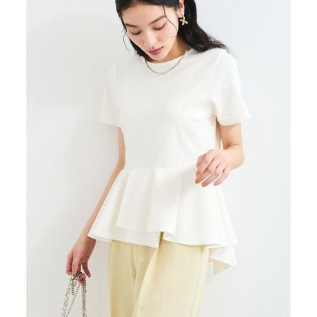 Tシャツにペプラムデザインをプラスし、異素材ドッキングしたデザイン。