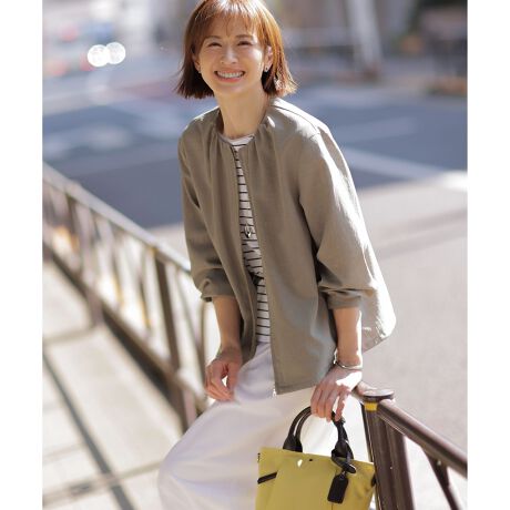 ギャザーデザインで女性らしさを演出!機能性に優れたノーカラーブルゾン
