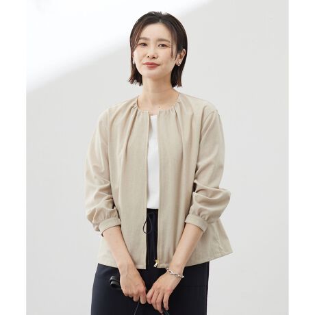 ギャザーデザインで女性らしさを演出!機能性に優れたノーカラーブルゾン