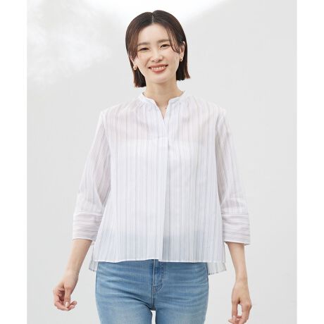 ■デザインスタンドカラーで前がV開きの涼しげなブラウス。シルエットは裾に向かって広がっているリラックス感のあるアイテムです。袖に切替を入れることで程よいボリュームが生まれ、サッと着るだけでトレンド感のある着こなしを叶えてくれます。インしなくてもスタイリングが決まるのも魅力です。袖丈も7分袖にしており、春夏の季節にぴったりの1枚となっております。裏地無しです。