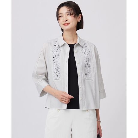 ■デザイントレンド感のあるグロップド丈の刺?ブラウス。フロント部分と袖に刺?をほどこし、またピンタックも入れた華やかさのあるデザインにしました。釦を閉じて一枚着とも、羽織りとしても着ていただけるので春夏のコディネートに活躍します。特にワイドパンツとのコーディネートが今年らしく着こなしが決まります。