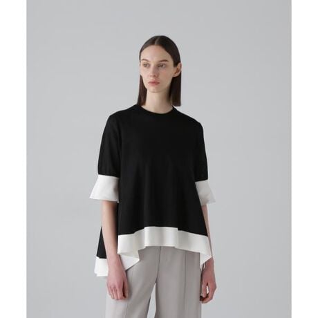切り替えでフレアをだし、後ろに向かって大きく前後差のついた着丈がドラマティックな1枚です。