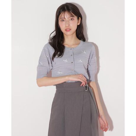 華奢なリボンを全面に飛ばしたオトナ可愛いニットトップス。さらりとしたキレイな表面感のニットなので暑い時期まで着ていただけます。複数の編み柄を組み合わせた立体的なジャガードに、華奢なリボンをつけた大人も着こなしやすいデザインです。半袖カーディガンとしても、前ボタンを留めてトップス風にも着回せます。※撮影時照明の関係により、色味が違って見える場合がございます。またパソコン・スマートフォンなどの環境により、若干製品と画像のカラーが異なる場合もございます。予めご了承ください。商品の色味は、商品単品画像をご参照下さい。※商品画像はサンプルのため、色味やサイズ等の仕様に変更がある場合がございますので、予めご了承ください。