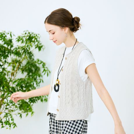 いつもの着こなしに変化をもたらせてくれるだけでなく着心地よく楽しめるニットベスト。ナチュラルな雰囲気で長く愛用していただけます。
