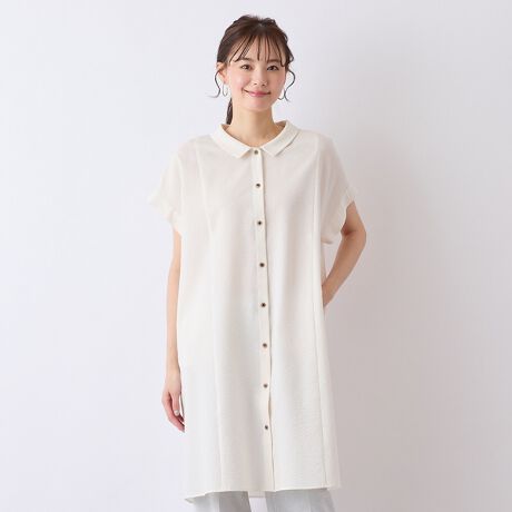 すとんとした直線ラインのロングブラウス。小さめの衿が可愛らしいデザイン。身巾広めでゆったりとしたシルエット。