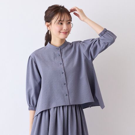 ドロップショルダーにイレギュラーヘムでデザイン性のあるブラウスに仕立てました。袖にはギャザーを寄せてふんわりと。さらりとしサッカー素材が気持ちの良いサマーブラウスです。