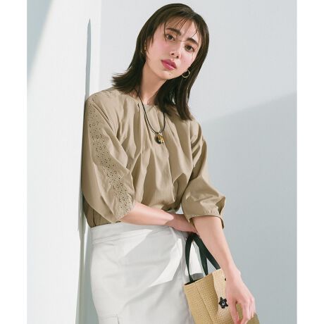 袖に入れたライン状のレース調刺繍が華やかなプルオーバーブラウス■デザイン立体感のあるパフスリーブに程よくカットワークを施したレース調刺繍を入れたプルオーバーブラウスです。程よくゆとりのあるボクシーなシルエットと少し短めのクロップド丈が今年らしく、前後差のある裾が腰周りをカバーしてくれます。様々なボトムに合わせやすいバランスで、女性らしい華やかさを感じられる1着です。■素材セルロース系再生繊維と綿を使用した、しなやかな風合いと程よい光沢感の素材です。滑らかなタッチで肌触りが良く、夏に向けて快適な着心地です。ストライプはブルーのシャンブレーに白のストライプが大きめのピッチで入った自由区オリジナルの柄です。先染めならではのストライプが美しく表現できるように無地と少し混率を変え、しなやかな風合いはそのままに程よく表情を感じるシャンブレー素材に仕上げました。■同素材アイテムシャツブラウス(BLW7GM0407)