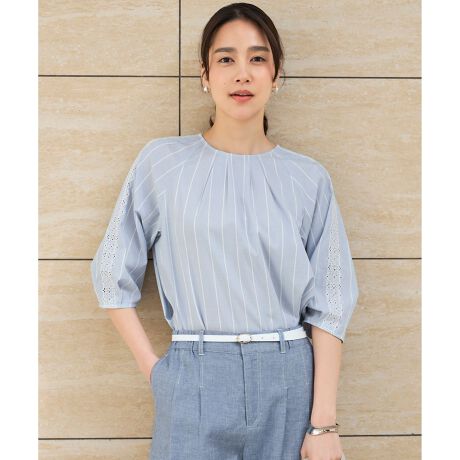 袖に入れたライン状のレース調刺繍が華やかなプルオーバーブラウス■デザイン立体感のあるパフスリーブに程よくカットワークを施したレース調刺繍を入れたプルオーバーブラウスです。程よくゆとりのあるボクシーなシルエットと少し短めのクロップド丈が今年らしく、前後差のある裾が腰周りをカバーしてくれます。様々なボトムに合わせやすいバランスで、女性らしい華やかさを感じられる1着です。■素材セルロース系再生繊維と綿を使用した、しなやかな風合いと程よい光沢感の素材です。滑らかなタッチで肌触りが良く、夏に向けて快適な着心地です。ストライプはブルーのシャンブレーに白のストライプが大きめのピッチで入った自由区オリジナルの柄です。先染めならではのストライプが美しく表現できるように無地と少し混率を変え、しなやかな風合いはそのままに程よく表情を感じるシャンブレー素材に仕上げました。■同素材アイテムシャツブラウス(BLW7GM0407)