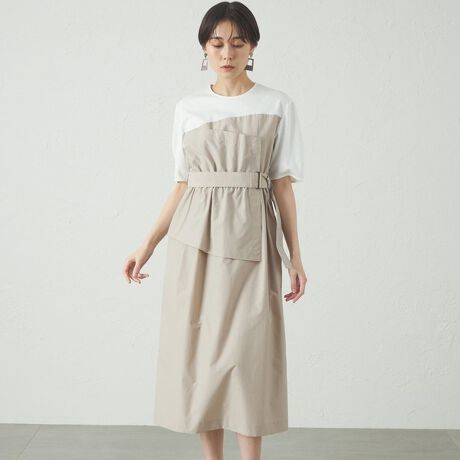 ビスチェを重ねたようなデザインが特徴的な異素材コンビワンピース。