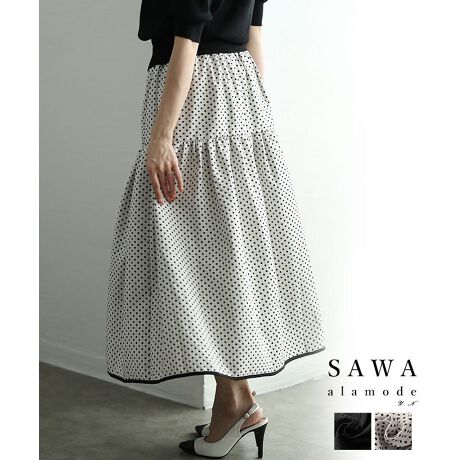 大人が穿けるパイピング裾のドット柄フレアスカート。ヒップから下に切り替えを入れることで腰周りをすっきり見え。切替えから下はギャザーでふんわり広がる女性らしいシルエットに。ウエストはゴム仕様で穿き心地もらくちん。スタイリング次第できれいめにもカジュアルにも見せられるアイテムです。