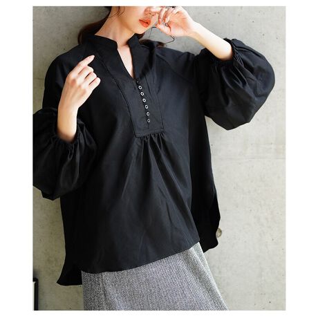 目を惹くシルエットのボリュームスリーブキーネックシャツブラウス。ギャザーの入ったボリューム感たっぷりの袖が華やかなデザイン。ネック部分に施された小さめのボタンが上品なアクセントに。キーネックの襟で大人の抜け感をプラス。肌触り良くハリ感があるのでシルエットを美しく演出。