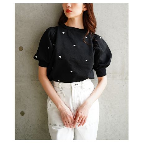 【セーター】 トップス ニット プルオーバー 黒 ブラック アイボリー 半袖 パフスリーブ ハート柄