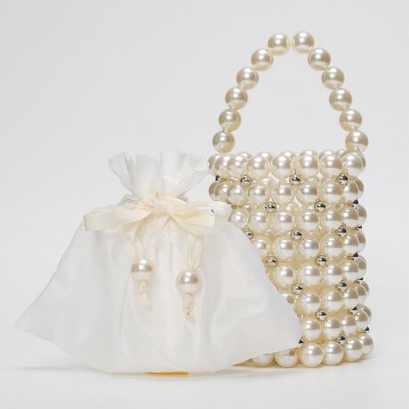 フェイクパールとシルバー/ゴールドのパーツを編み込んだ高級感あるミニバッグ。