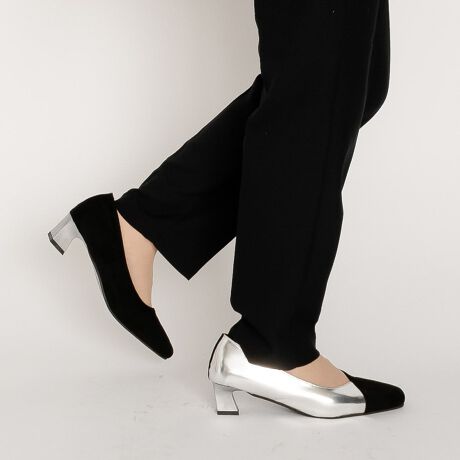 アシンメトリーに切り替えたメタリックカラーとブラックのコントラストが洗練された印象で、360度どこから見てもおしゃれな一足です。