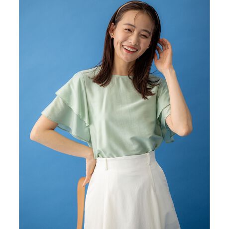 ■デザインややボートネックのデザインは首を長くみせ、ティアードフレア袖で腕を華奢にみせてくれるTブラウス。エレガントでありながらカジュアルにも着こなせるスタイリング万能な1枚です。ボトムにインしてエレガントにも着こなせますが、裾は前後差のあるシャツテール仕様なのでアウトしたパンツスタイルもおススメです。三角マチで脇が見えすぎないようにカバーしています。後ろあきには貝釦を使用。