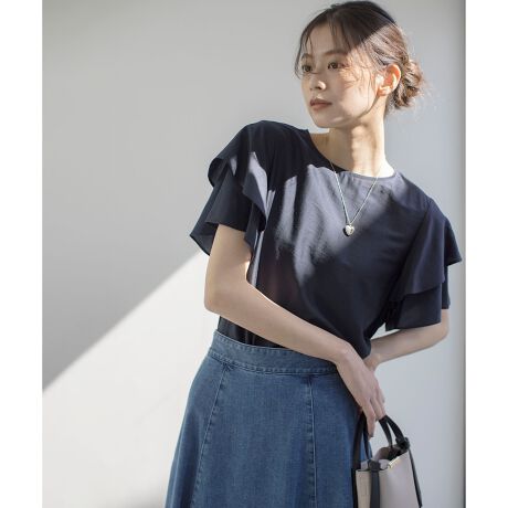 ■デザインややボートネックのデザインは首を長くみせ、ティアードフレア袖で腕を華奢にみせてくれるTブラウス。エレガントでありながらカジュアルにも着こなせるスタイリング万能な1枚です。ボトムにインしてエレガントにも着こなせますが、裾は前後差のあるシャツテール仕様なのでアウトしたパンツスタイルもおススメです。三角マチで脇が見えすぎないようにカバーしています。後ろあきには貝釦を使用。