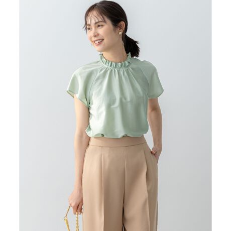 ■デザインフリルハイネックのラグランフレンチスリーブは1枚で着映えが叶います。ジャケットインやレイヤードアイテムとして着回し抜群のブラウス。インしてスカートスタイルにも、裾にスリットも入っているのでアウトしてパンツスタイルにもおすすめです。スタンドフリル襟からのギャザーは程よく身体から離れ、袖はフレンチスリーブなので気になる二の腕もカバーしてくれます。