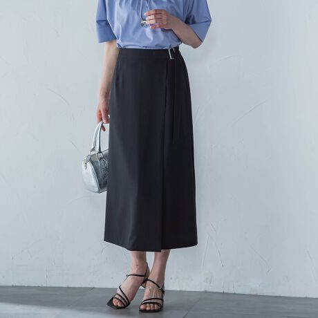 通勤シーンにも活躍する上品なナローシルエットのラップスカート。